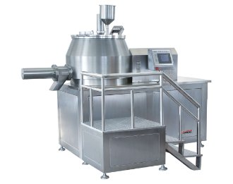 粉体物料与粘合剂在圆筒(锥形)形容器中,由底部混合浆充分混合成湿润软材,然后由侧置的高速粉碎桨切割成均匀的湿颗粒。